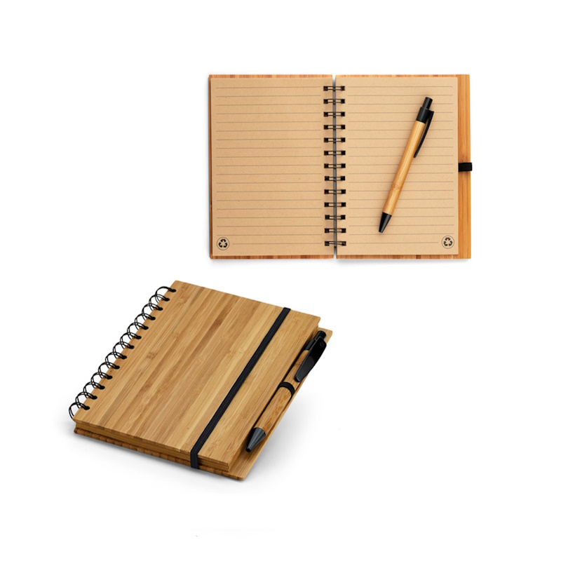 Bloco A5 capa dura em bambu com 70 folhas pautadas, papel reciclado e esferográfica de bambu inclusa. Acabamento wire-o. Gravação a laser na capa. Fornecido em saco plástico