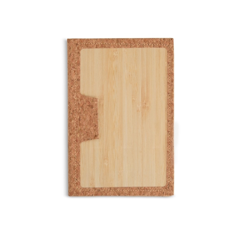 PL BL 067 – Bloco moleskine capa de bambu 15x 21 cm, com detalhe em cortiça, 96 folhas brancas pautadas e suporte para caneta.