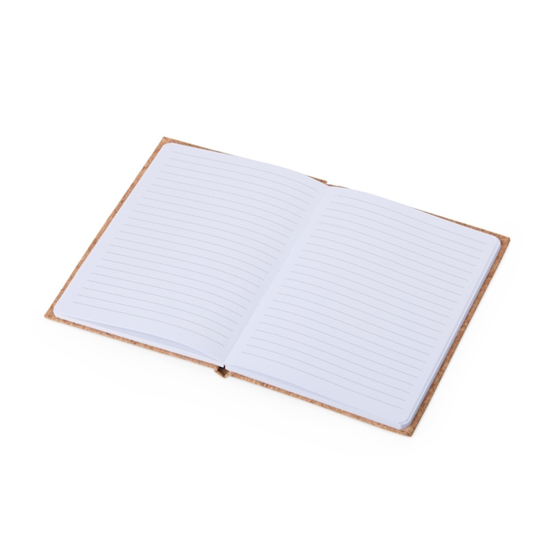 Bloco moleskine capa de bambu 15x 21 cm, com detalhe em cortiça, 96 folhas brancas pautadas e suporte para caneta. Impressão frontal a uma cor