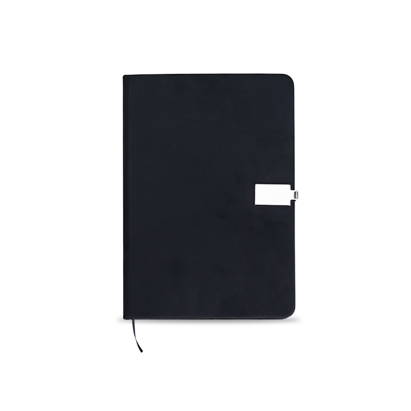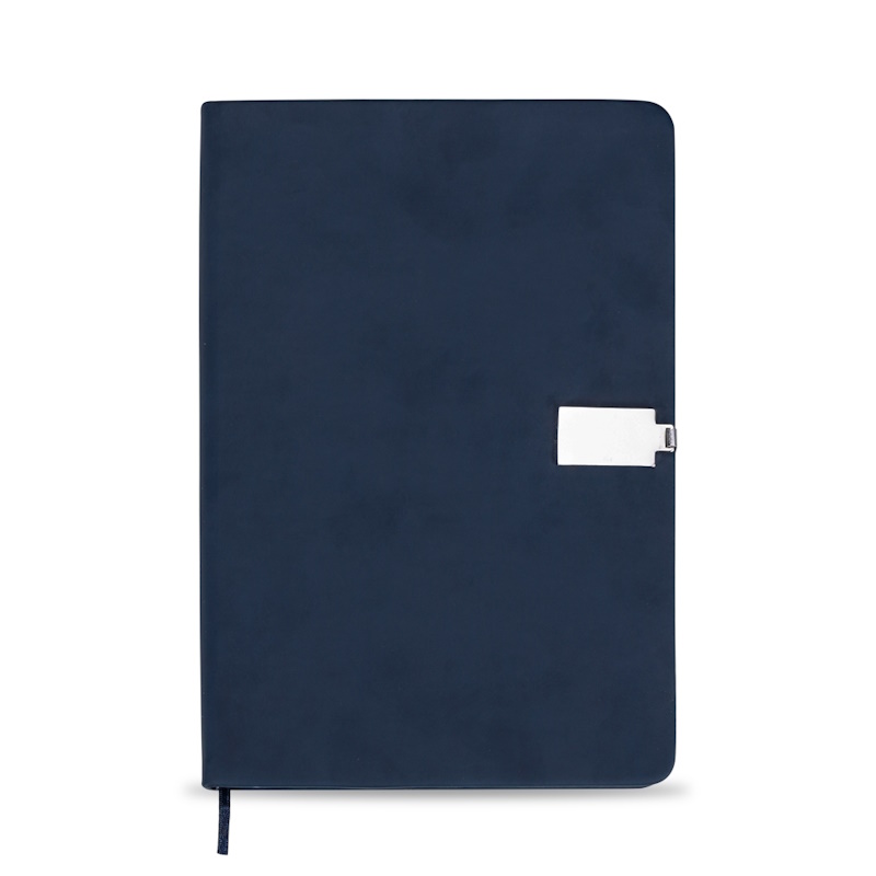 Bloco moleskine capa emborrachada preta ou azul, com fecho metálico imantado, 96 folhas brancas pautadas e fita de cetim. Impressão frontal a uma cor.