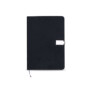 PL BL 068 – Bloco moleskine capa emborrachada preta ou azul, com fecho metálico imantado, 96 folhas brancas pautadas e fita de cetim.
