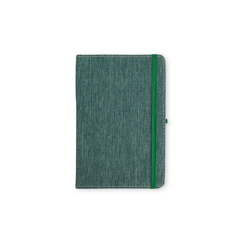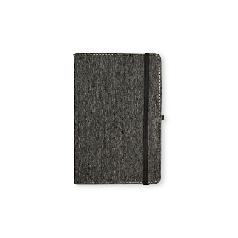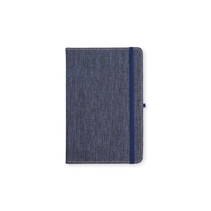 Bloco moleskine capa telada várias cores, 14 x 20 cm, com 80 folhas brancas pautadas e porta caneta. Impressão frontal a uma cor