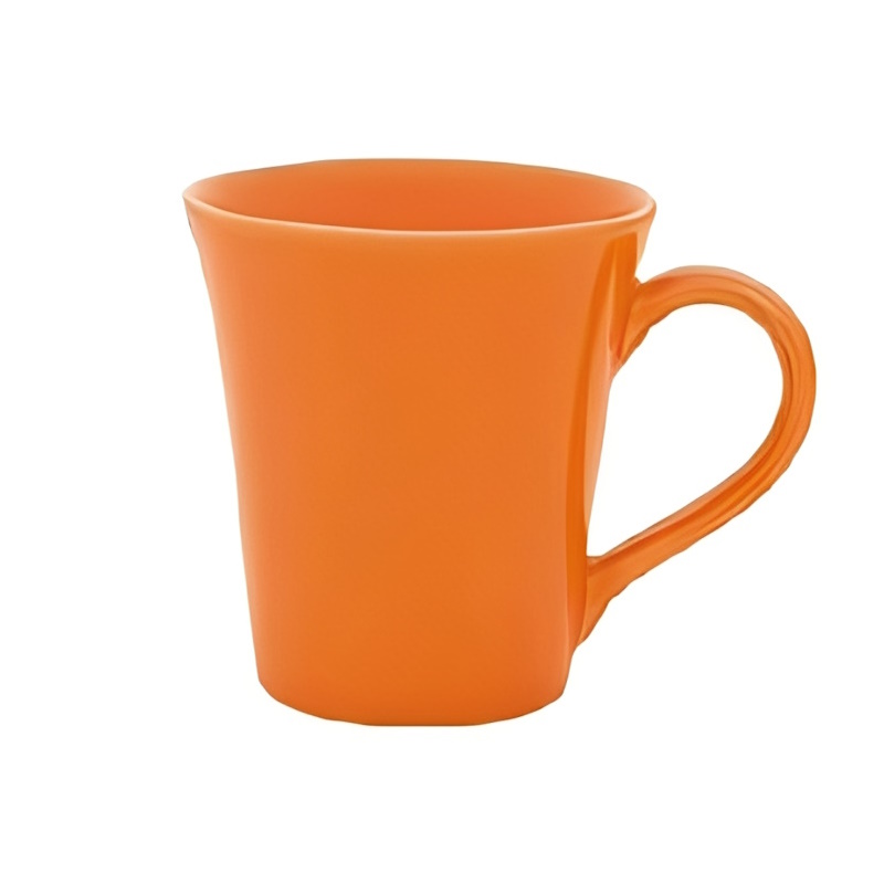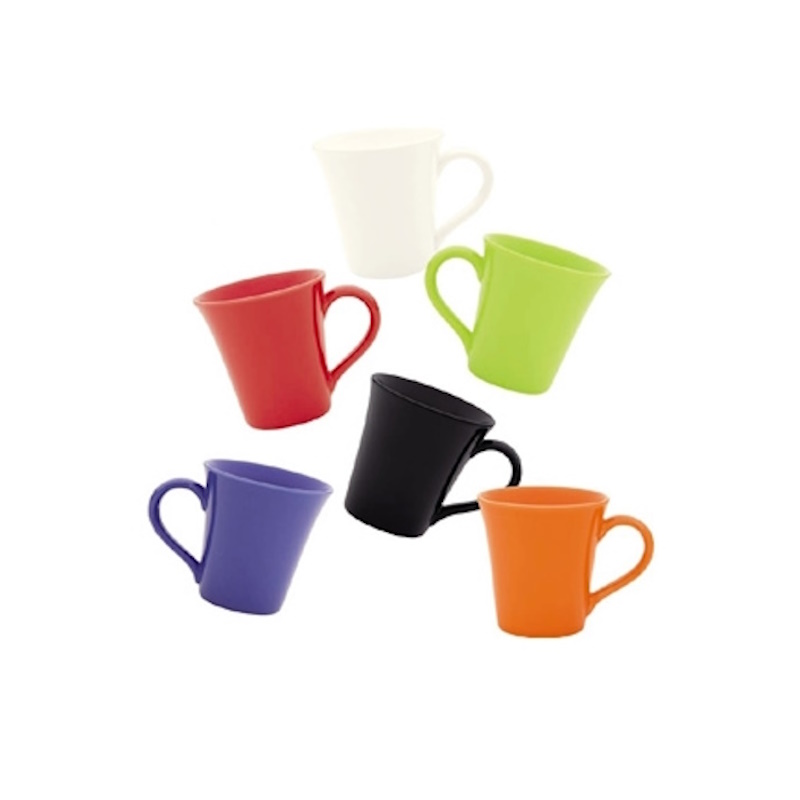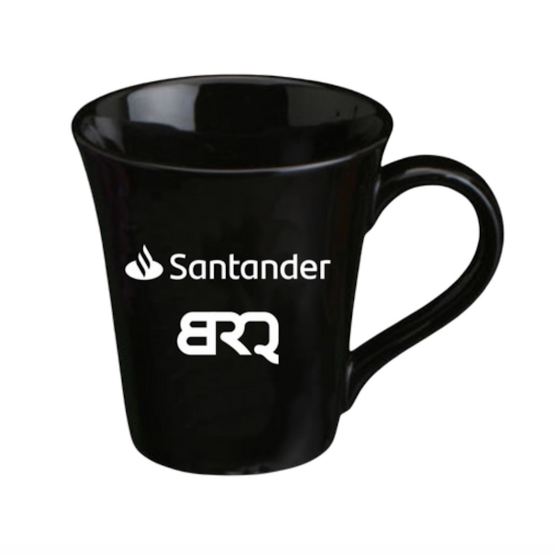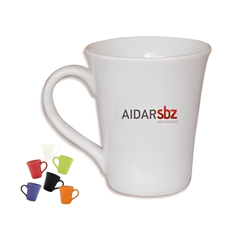 Caneca tulipa de porcelana branca, 330 ml. Impressão uma cor em uma face. Fornecida em caixa de 24 peças