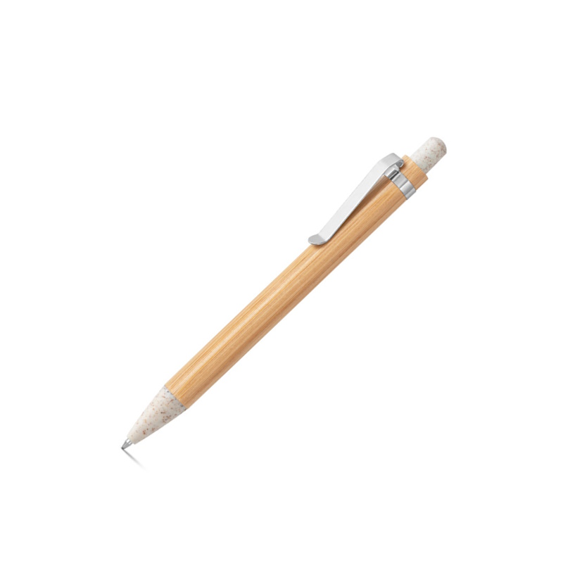 Caneta esferográfica em bambu com clipe metálico e detalhes coloridos em fibra de trigo. Impressão em PDP.