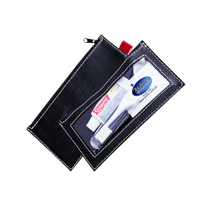 Conjunto bucal em couro natural ou sintético várias cores, 20 x 10 cm, com escova, pasta dental e visor cristal com ziper superior. Gravação em baixo relevo frontal
