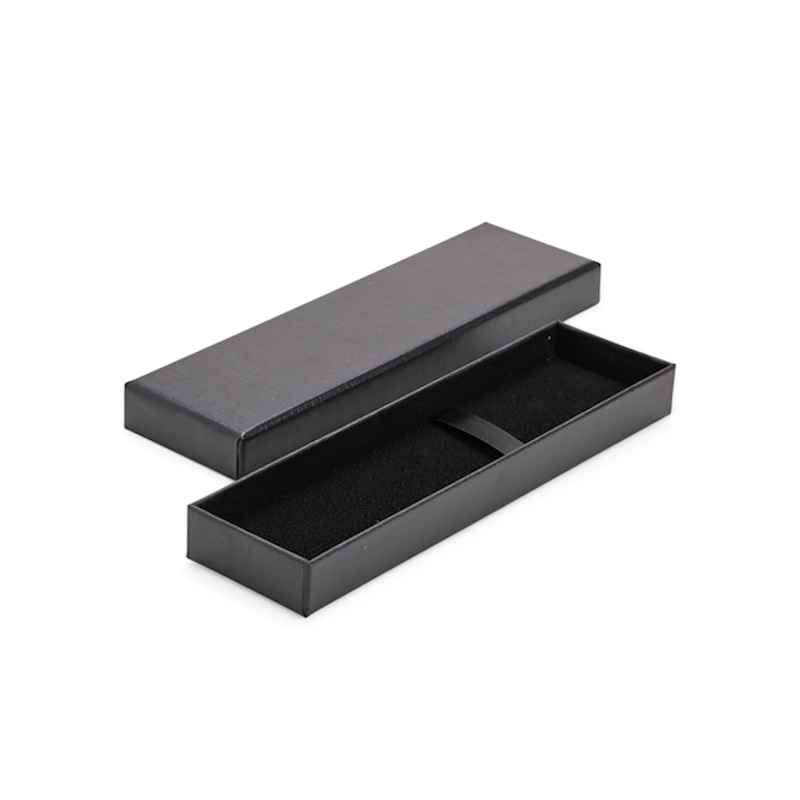 PL EMB 057 – Estojo em cartão com revestimento em papel tela preto, 5 x 21 cm, com interior aveludado e fita de cetim preta