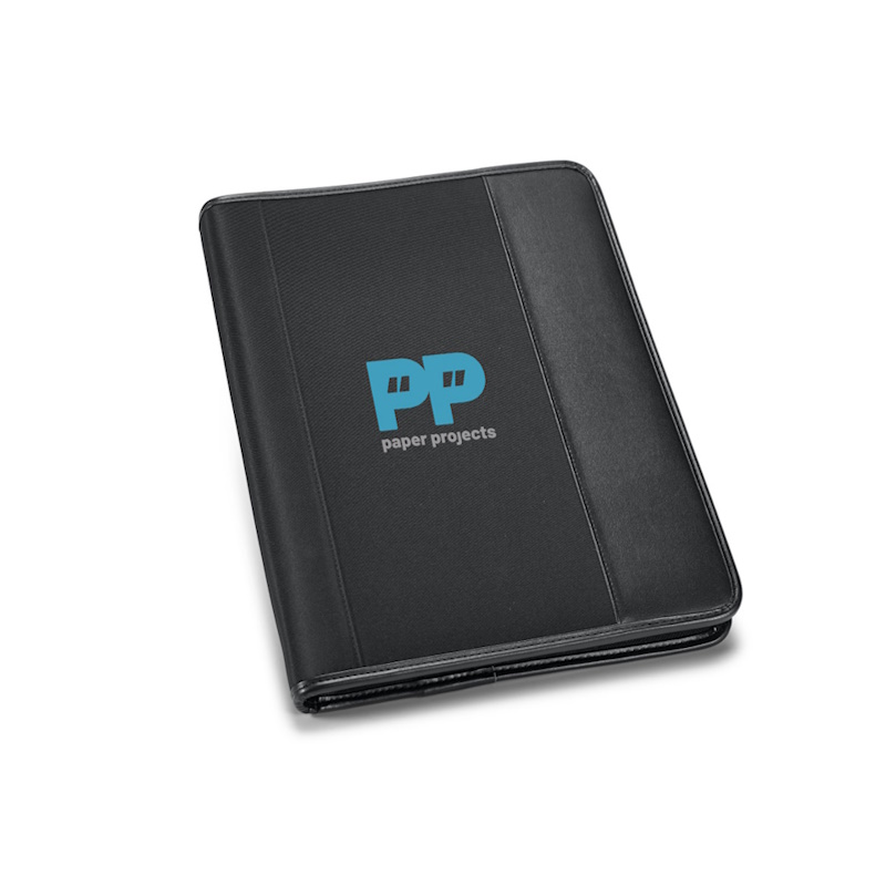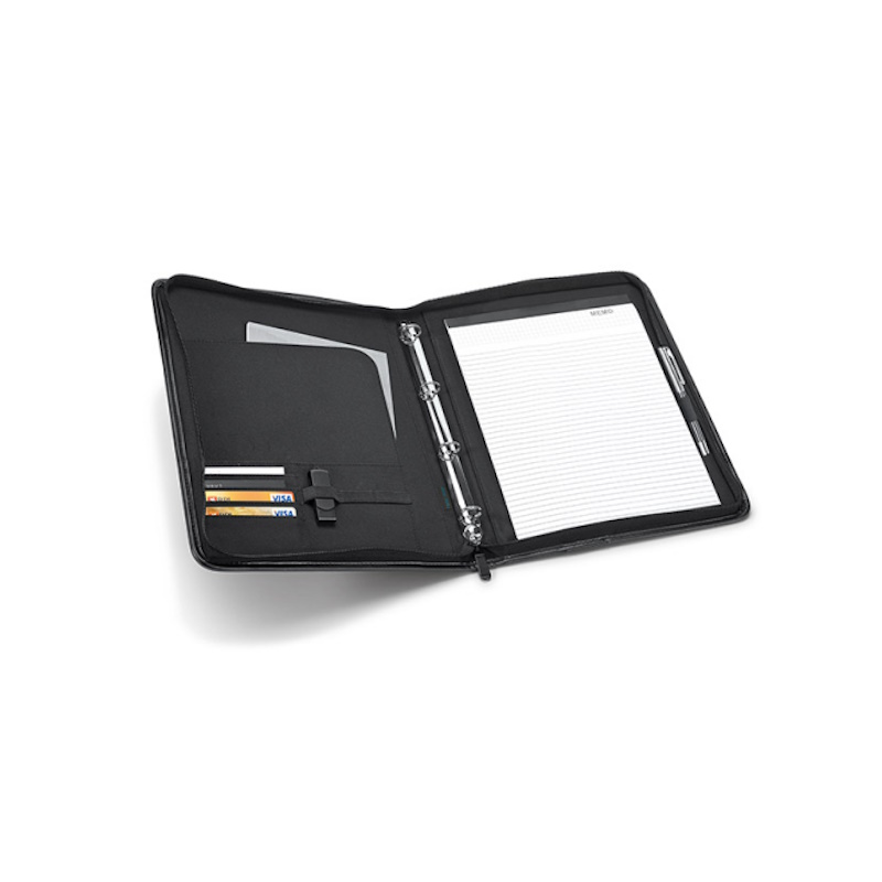 Sofisticada pasta A4 da Jaques Laffit em couro ecológico e microfibra. Contém 4 argolas de 20 mm e bloco com 20 folhas pautadas, 265 x 340 x 45 mm. Aplicação de transfer frontal uma cor. Fornecido em saco plástico individual