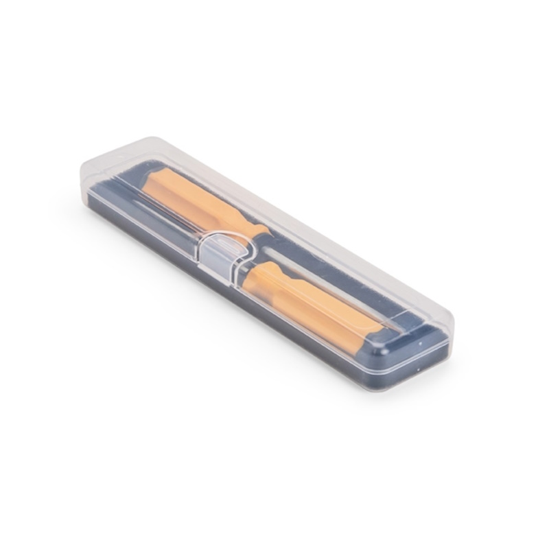 Conjunto de ferramentas com chaves de fenda e philips, cabo plástico amarelo, 50 x 210 mm. Impressão a uma cor no estojo plástico cristal.